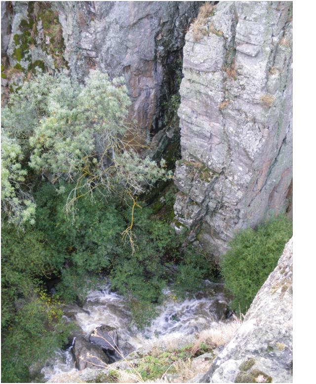 Un ejemplo espectacular de encajamiento fluvial por abrasión lo ofrece el río Moros en el paraje La Risca, en Valdeprados. El tajo que forma el río en esta localización tiene unos 250 metros de largo, más de 30 metros y apenas unos pocos metros de anchura. Tan vertical y estrecha es la hendidura que podríamos hablar, más de una garganta, de un auténtico desfiladero: "paso estrecho entre paredes más bien verticales"; quizá el único de la provincia de Segovia con estas características, aunque no tengamos noticias de que ninguna tropa haya tenido que reducir el frente de su formación para poder pasar "en fila" por este lugar, situación a la que parece deber su nombre esta singular forma fluvial.[Extracto de "Las Raíces del Paisaje"]