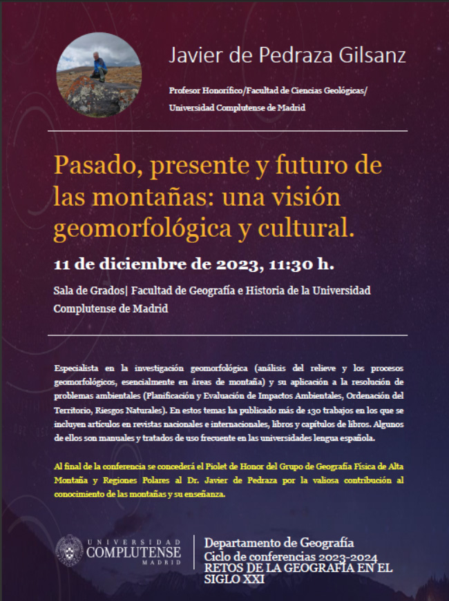 Por todo ello y mucho más que olvidamos enumerar, el lunes 11 de diciembre de 2023, el Grupo de Geografía Física de Alta Montaña y Regiones Polares de la Universidad Complutense de Madrid le entregará un merecido Piolet de Honor, tras impartir una interesante conferencia. Enhorabuena, Javier.